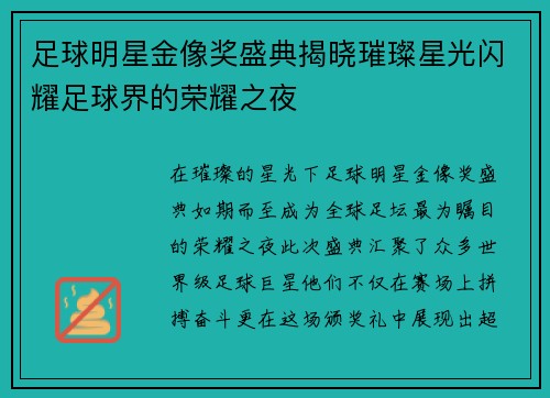 在璀璨的星光下,足球明星金像奖盛典如期而至,成为全球足坛最为瞩目的荣耀之夜。此次盛典汇聚了众多世界级足球巨星,他们不仅在赛场上拼搏奋斗,更在这场颁奖礼中展现出超凡的魅力与风采。活动现场,各项大奖的揭晓引发了热烈的讨论,这些奖项不仅是对球员们过去一年表现的认可,更象征着足球运动发展的辉煌历程。文章将从...